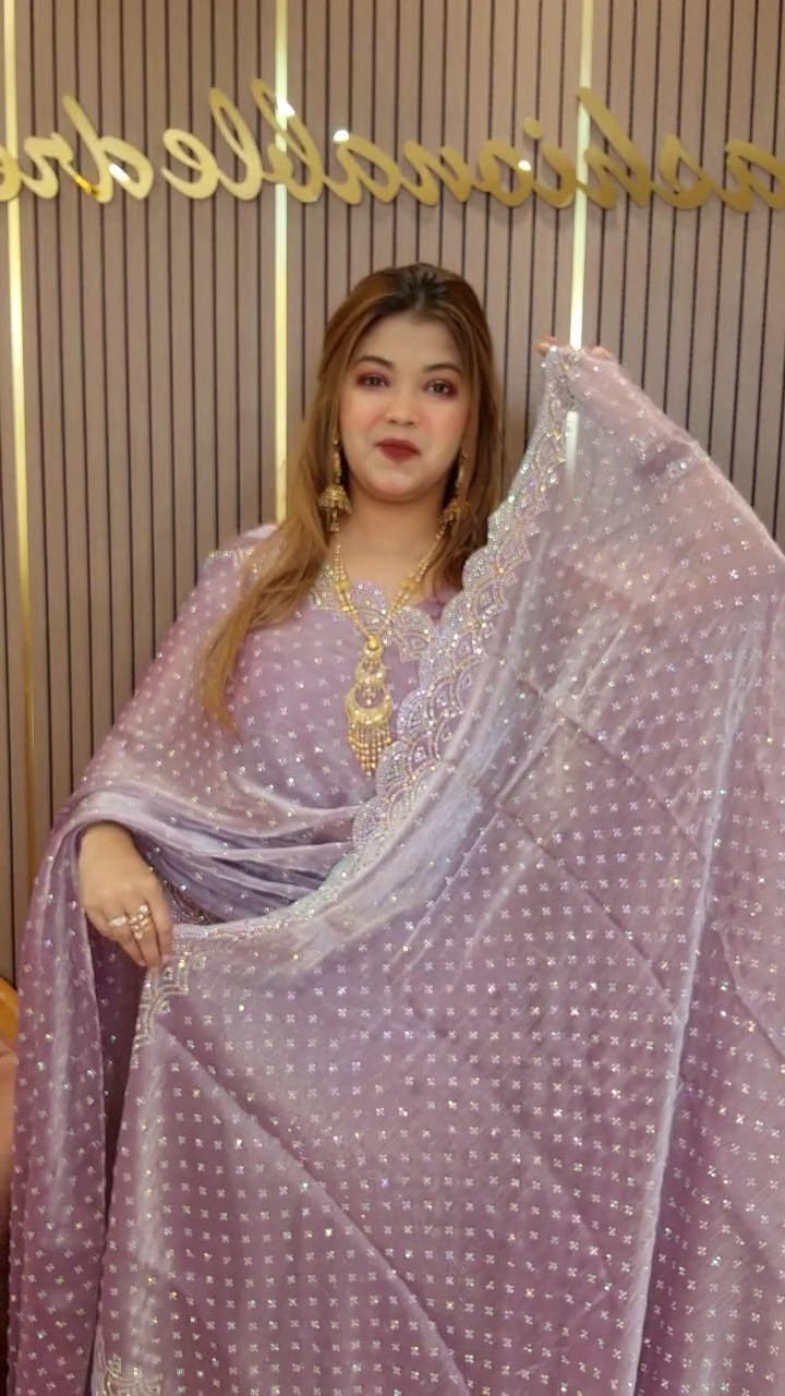 এই শাড়িটি তৈরি করা হয়েছে ইমপোর্টেড জিমি চু ফেব্রিক দিয়ে। পুরো শাড়ি জুড়ে রয়েছে আকর্ষণীয় দুবাই মাল্টি স্টোন ওয়ার্ক, যা আপনার সাজে যোগ করবে এক অনন্য আভিজাত্য।